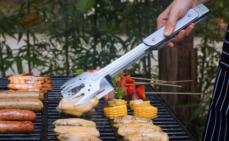 С помощью ножа длиной 13 см легко порезать рыбу, мясо, овощи для гриля или фрукты для пикника. Щипцы, лопатка и вилка позволят удобно переворачивать продукты на решетке и накладывать еду в тарелки, не боясь обжечься.