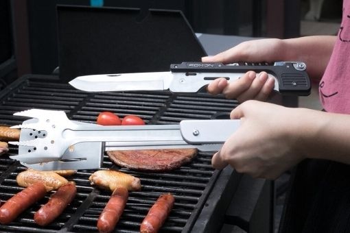 Показательным является мультитул Roxon S601 с шестью функциями, который помимо основных принадлежностей включает мелкие дополнения в виде штопора и открывалки для бутылок. Особенностью модели является вариативность эксплуатации: основные инструменты могут отсоединяться друг от друга при нажатии кнопки блокировки и использоваться по отдельности. Лопатка и вилка крепятся к ножу и образовывают импровизированную лопатку, которую можно использовать для переворачивания мяса. Процесс облегчают четыре острых зубчика вилки, которые предотвращают соскальзывание пищи с лопатки. Все инструменты изготовлены из нержавеющей стали 5Cr15MoV, обладающей коррозионной стойкостью.