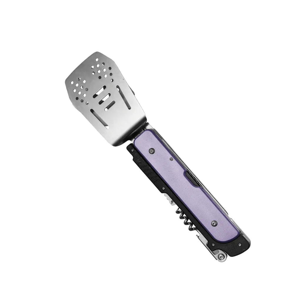 Непосредственно к ножу крепятся лопатка и вилка. Оба инструмента сделаны полностью металлическими, со складной ручкой. У вилки 4 зубчика с зазубринами, чтобы мясо не соскальзывало с нее. Есть отверстия для стекания жира. Такие же отверстия сделаны и на лопатке. Вилку с лопаткой можно соединить таким образом, чтобы они играли роль щипцов.
