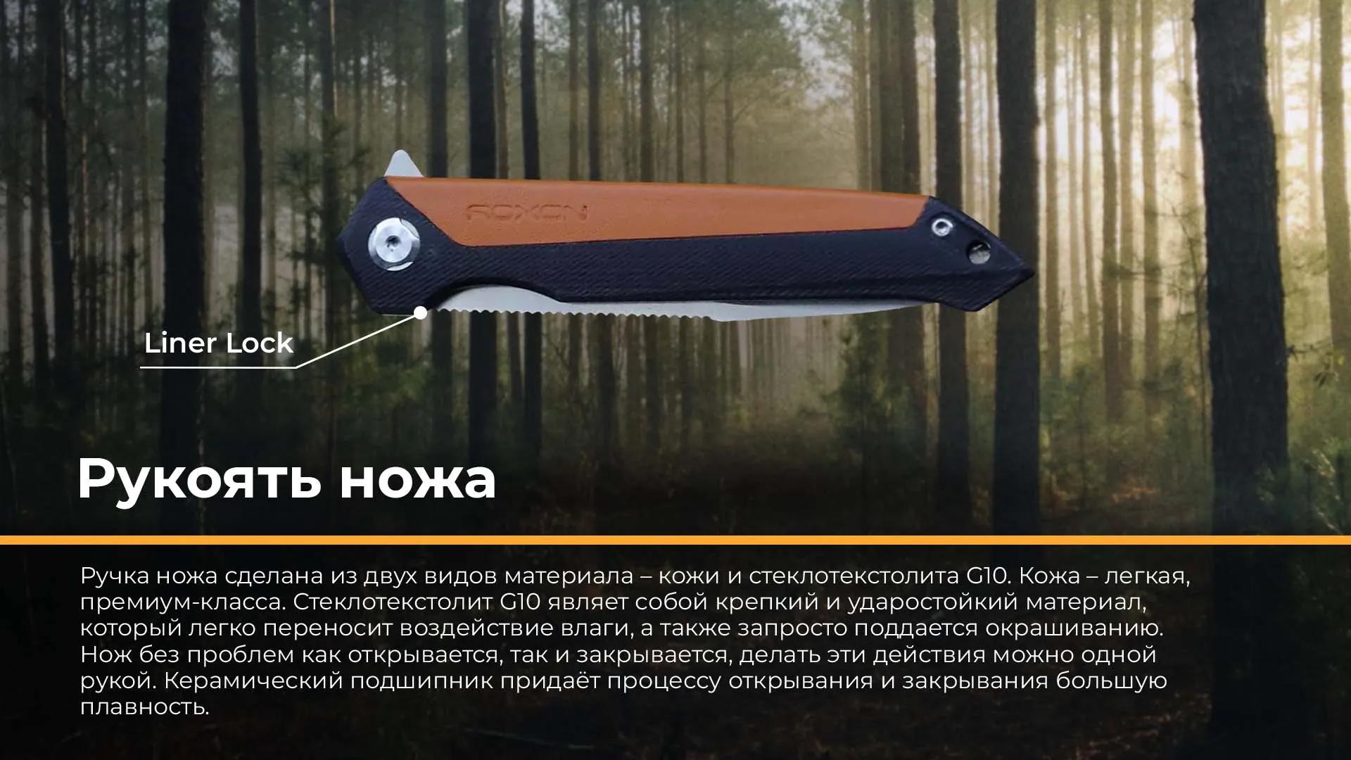 Нож с лёгкостью как открывается, так и закрывается, и можно это сделать одной рукой. Керамический подшипник делает процесс открывания и закрывания более плавным. Замок разновидности флиппер, безопасность эксплуатации.